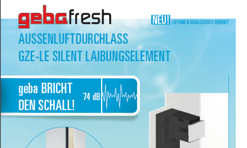 Das geba Laibungselement GZW-LE Silent erreicht eine maximale Normschallpegeldifferen (Dn, e, w) von 74dB bei einem gleichzeitigen Volumenstrom von 18 m3/h. Die Schallmessungen wurden beim Institut für Fenstertechnik (ift Rosenheim) durchgeführt.